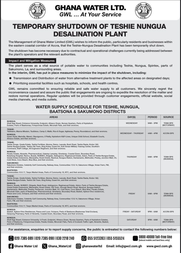 Ghana Water Limited (GWL) has announced a water rationing timetable for residents in selected areas of Teshie, Nungua, Baatsona, and Sakumono to address ongoing supply challenges.