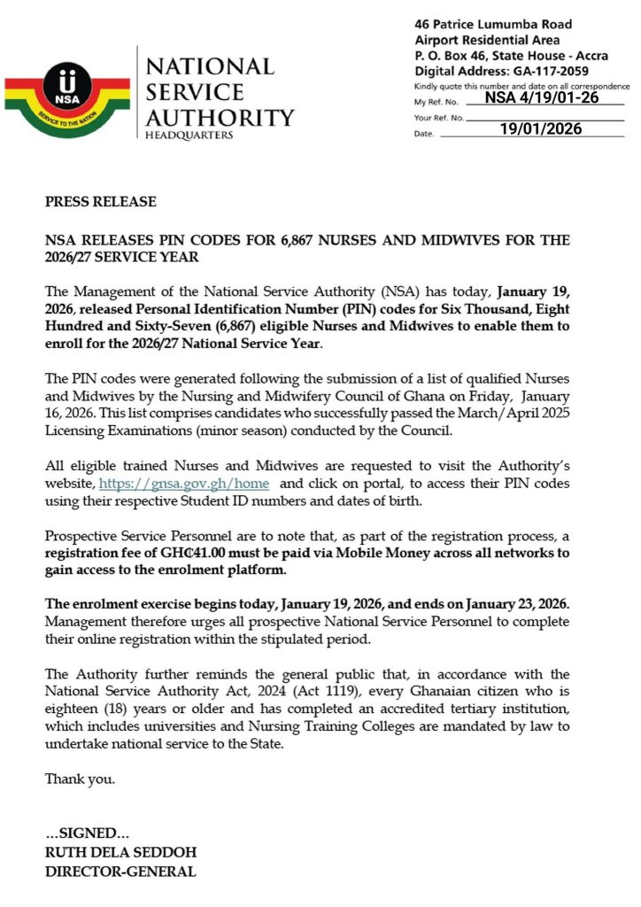 The National Service Authority (NSA) has issued Personal Identification Number (PIN) codes to 6,867 nurses and midwives qualified to register for the 2026/2027 national service year.